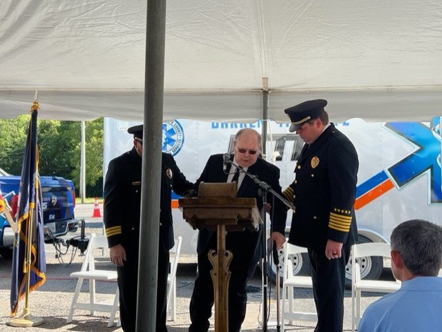 Asst. Dir. Garland Gilliam and Director Joe Middleton helped former EMT worker Danny Sexton stand for the prayer. Photo by Jennifer Moonsong
