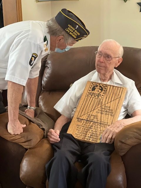 Ross was the oldest man in the squad at 22 years of age. The men who served under him were 20 and 18. Thursday, as part of the celebration of honor at his home in Cave City, he was presented with a plaque. Those young men’s names are carved on the plaque. He was also presented with a large box of letters from local school children thanking him for his service to our country.