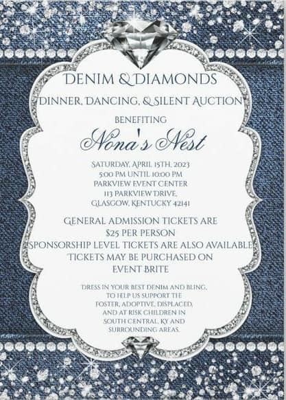 Denim & Diamonds is set for the evening of April 15 at the Parkview Event Center in Glasgow. Plans for the evening include dinner, dancing, and a silent auction. Tickets for the evening can be purchased through EventBrite.com or by contacting Nona’s Nest.