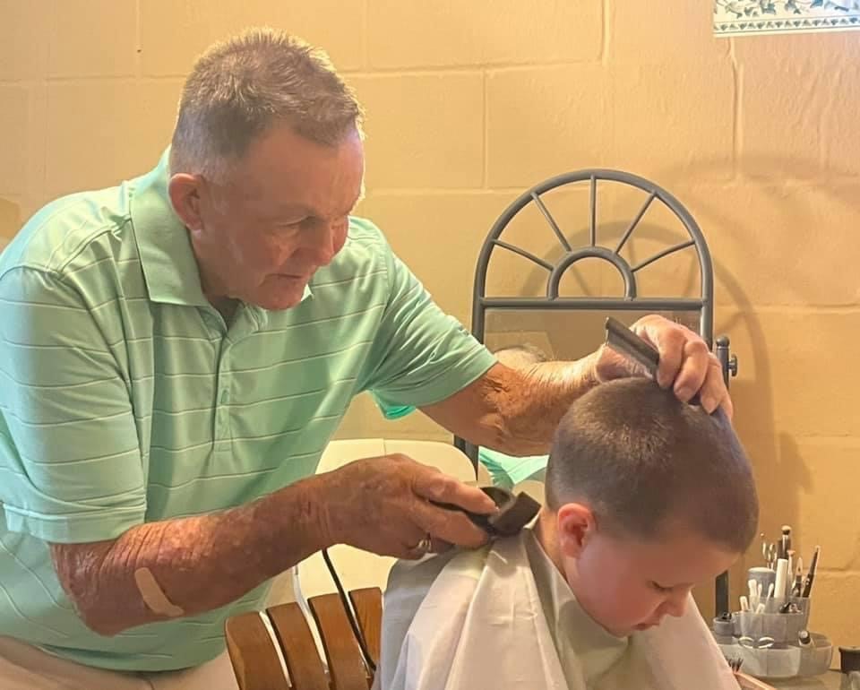 Shipp giving his great-nephew, Gage England, a haircut before his school picture day in 2021. Photo submitted