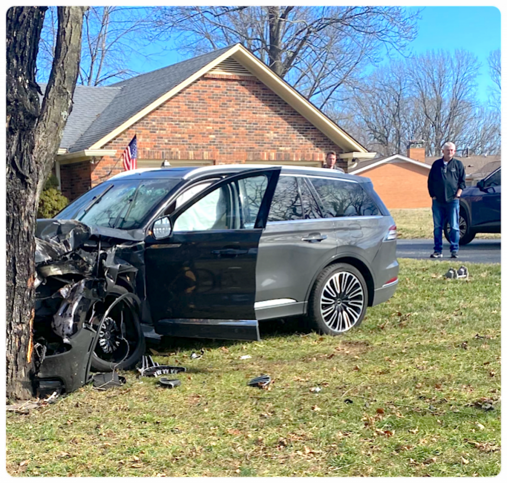 Hunter Vann crashed a 2022 Lincoln into a tree on Sheila Drive on Feb. 1 following a short pursuit from the Barren River Drug Task Force. He sustained injuries that led to him being flown out for more medical attention. Photo submitted