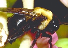 Kentucky has several species of Carpenter Bees (Wood Bees) which make holes in wood to lay eggs and leave nectar and pollen for the newly hatched bees. They do not live in hives. Photo | University of Kentucky Entomology