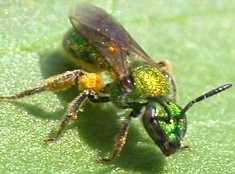 Most halictid bees are shiny black, metallic green, or metallic blue. Some members of this species are referred to as sweat bees. Most halictid bees are solitary and create underground nests for their offspring. Photo | University of Kentucky Entomology