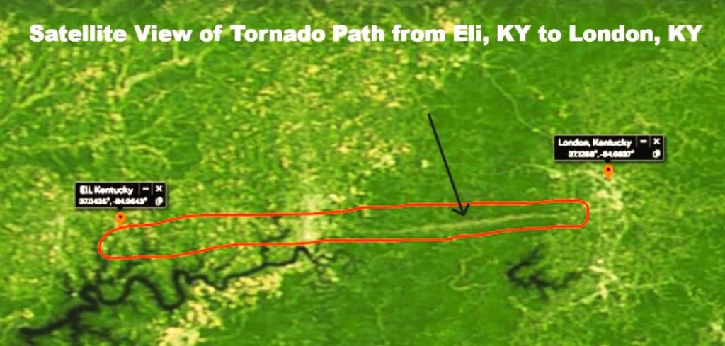 This same tornado that struck in Somerset and later in London is believed to have first touched down near Eli, Ky., a community located in Russell County. The distance between Eli and London is approximately 56 miles.