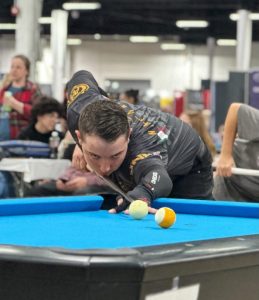 Dylan Hammontree plays a game of billiards at the 2025 Super Billiards Expo in Philadelphia, Pennsylvania, in April, where he was asked to join the Longoni Next Gen pro youth team with Longoni Cues of Italy. Photo | Submitted