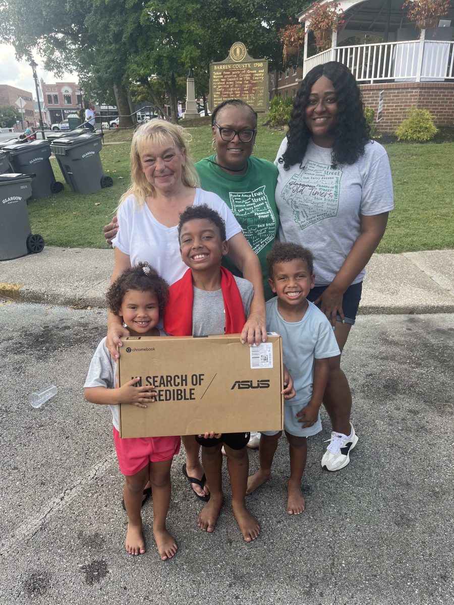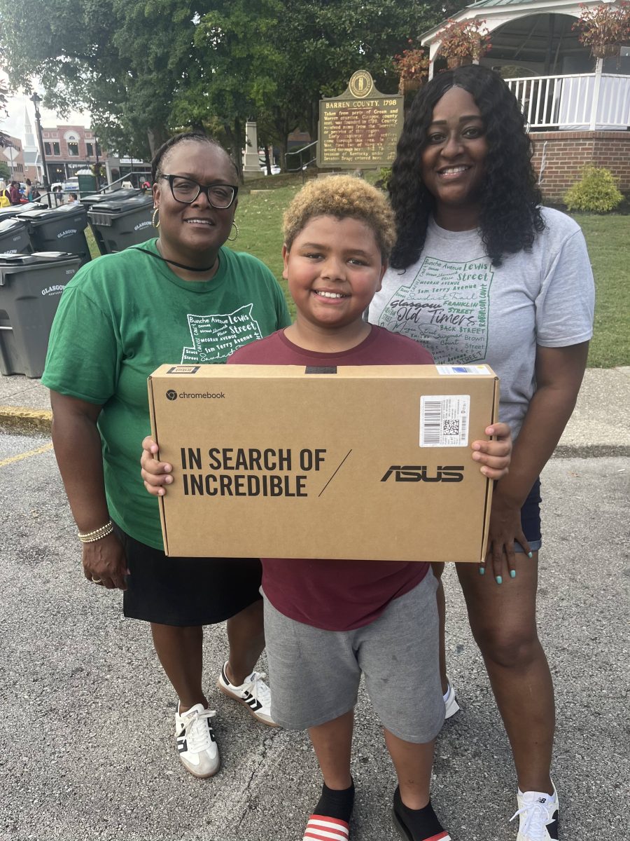 Another winner with Jeremy Mays (center) and his brand new laptop he won in a raffle drawing on Glasgow Public Square during a back-to-school bash, Rock the Block. Also pictured, at left, is Felicia Allen and Nathan Allen.
