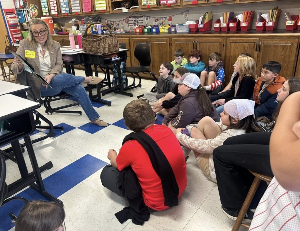 Kentucky Farm Bureau Agency Manager Tareen Horton is reading to students. Photo | Metcalfe County Schools